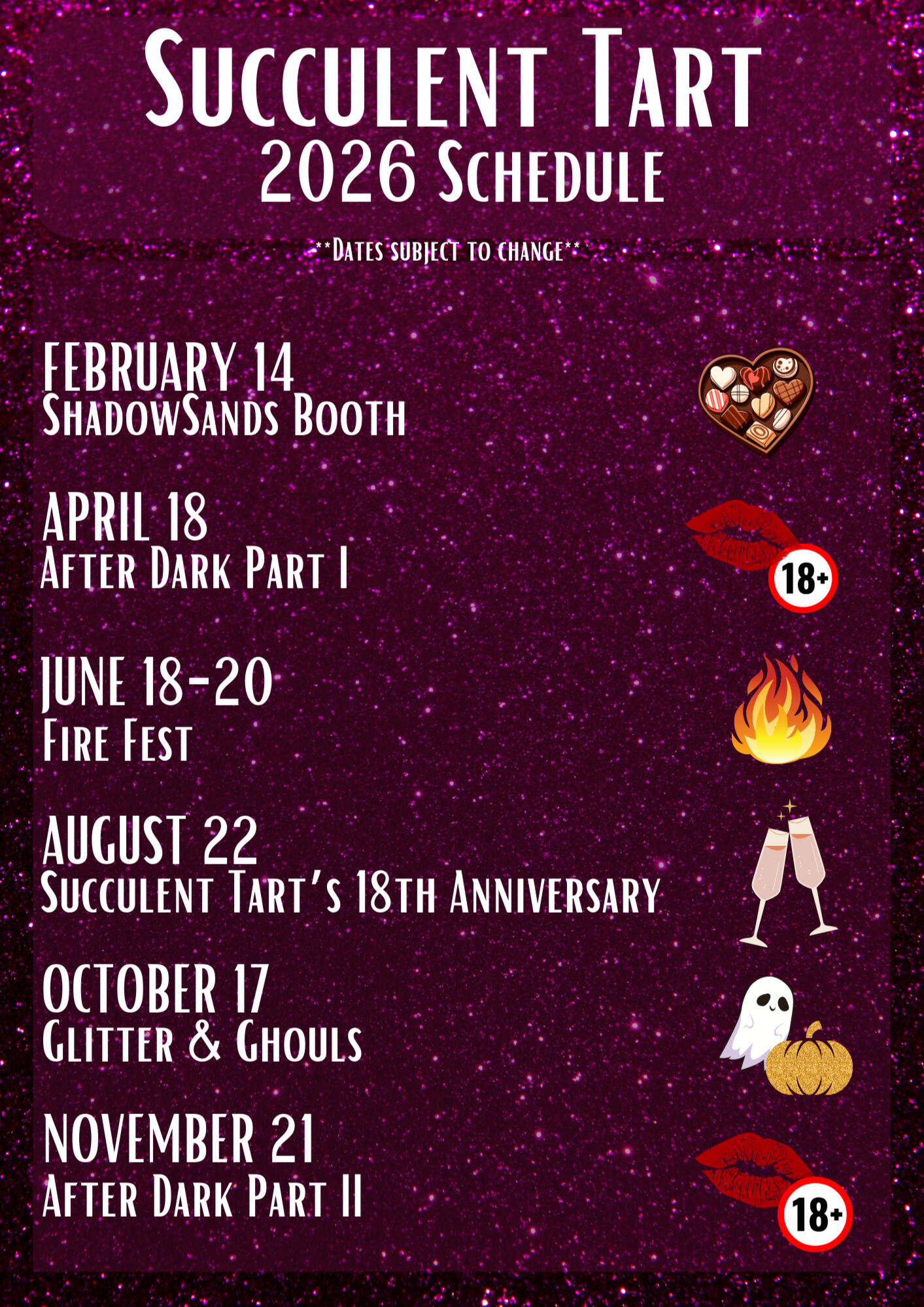 | April 18th (19th AUS) | Tarts After Dark: Part I (18+) | 6 PM | 11 AM |