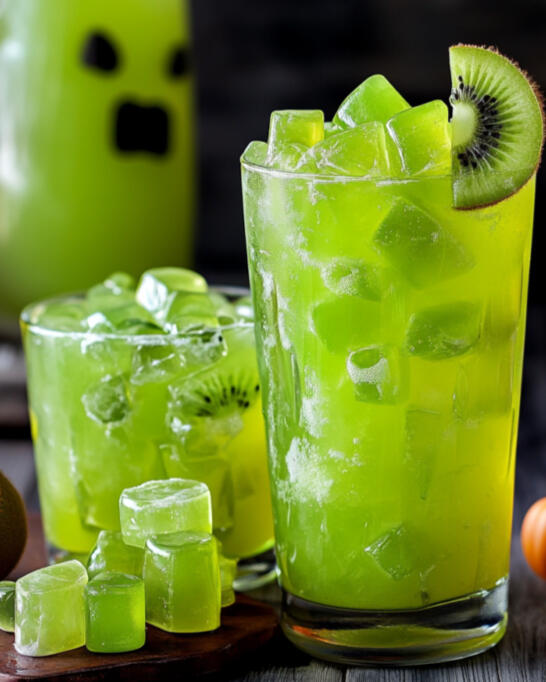 Kiwi juice, limeade & lemon-lime kaja cola served with cubes of green jelly 'slime' & slices of kiwi fruit.
