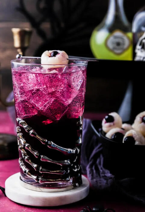 Grenadine, blue curacao & cranberry-pomegranate juice, topped with club soda & garnished with a lychee 'eyeball'.